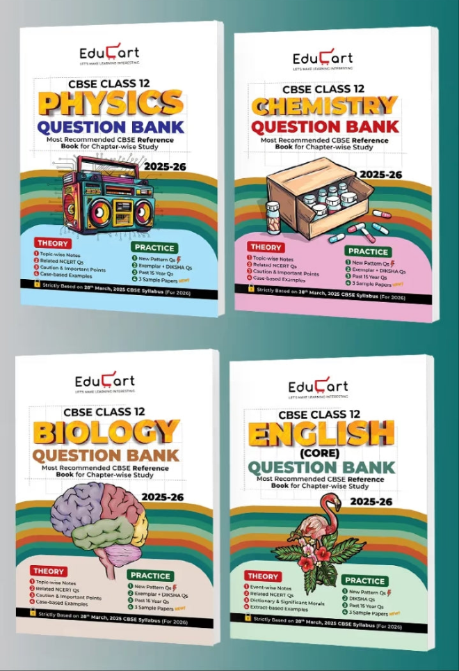Educart CBSE Question Bank Class 12 2025-26 Physics, Chemistry, Biology and English on New Syllabus 2025-26 (Includes Past Years Solved Questions) Set of 4 Books